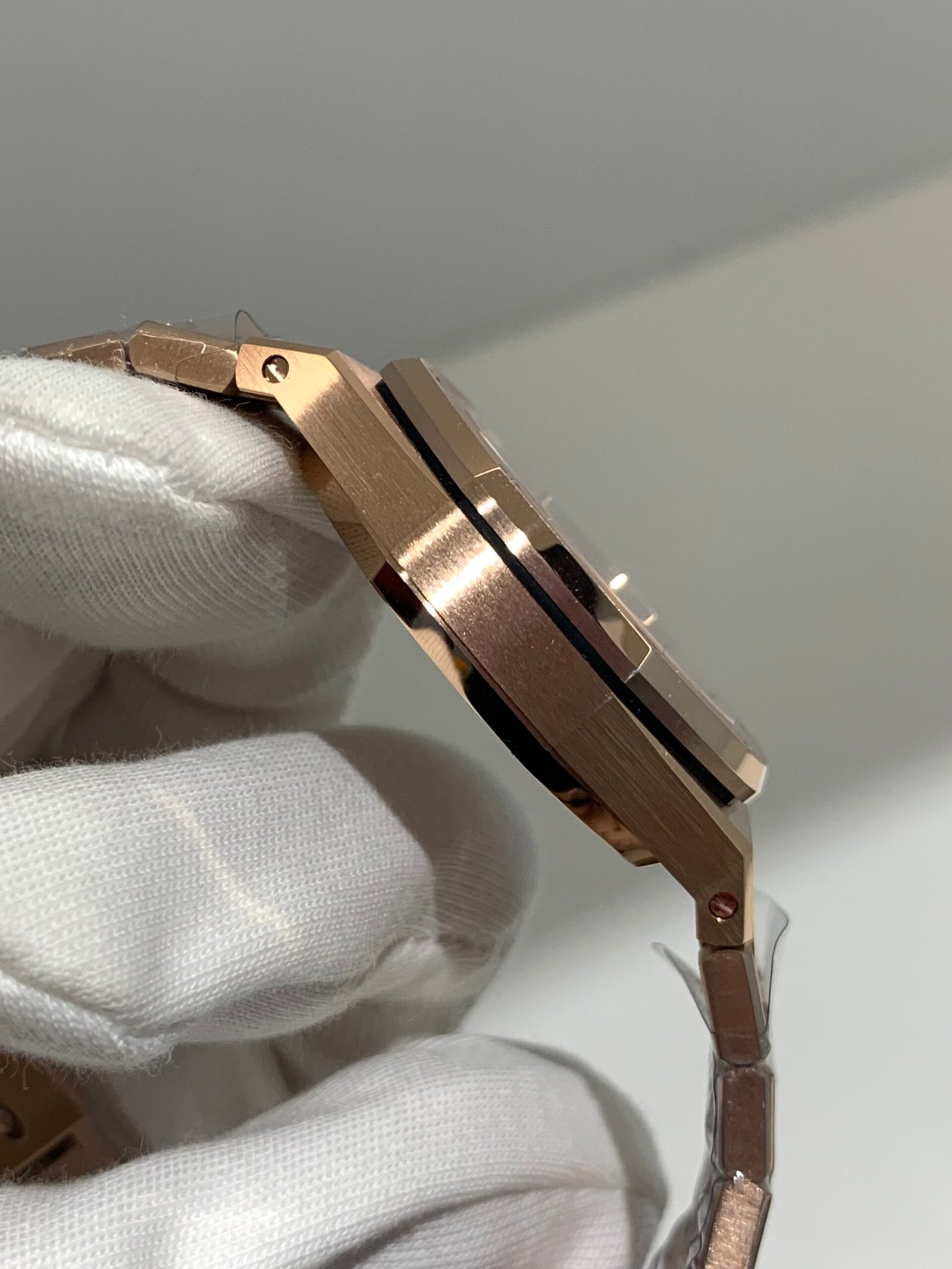 Vertical brushing on the face with highly polished beveled edges. The 8 hexagonal rose gold screws are recessed perfectly.