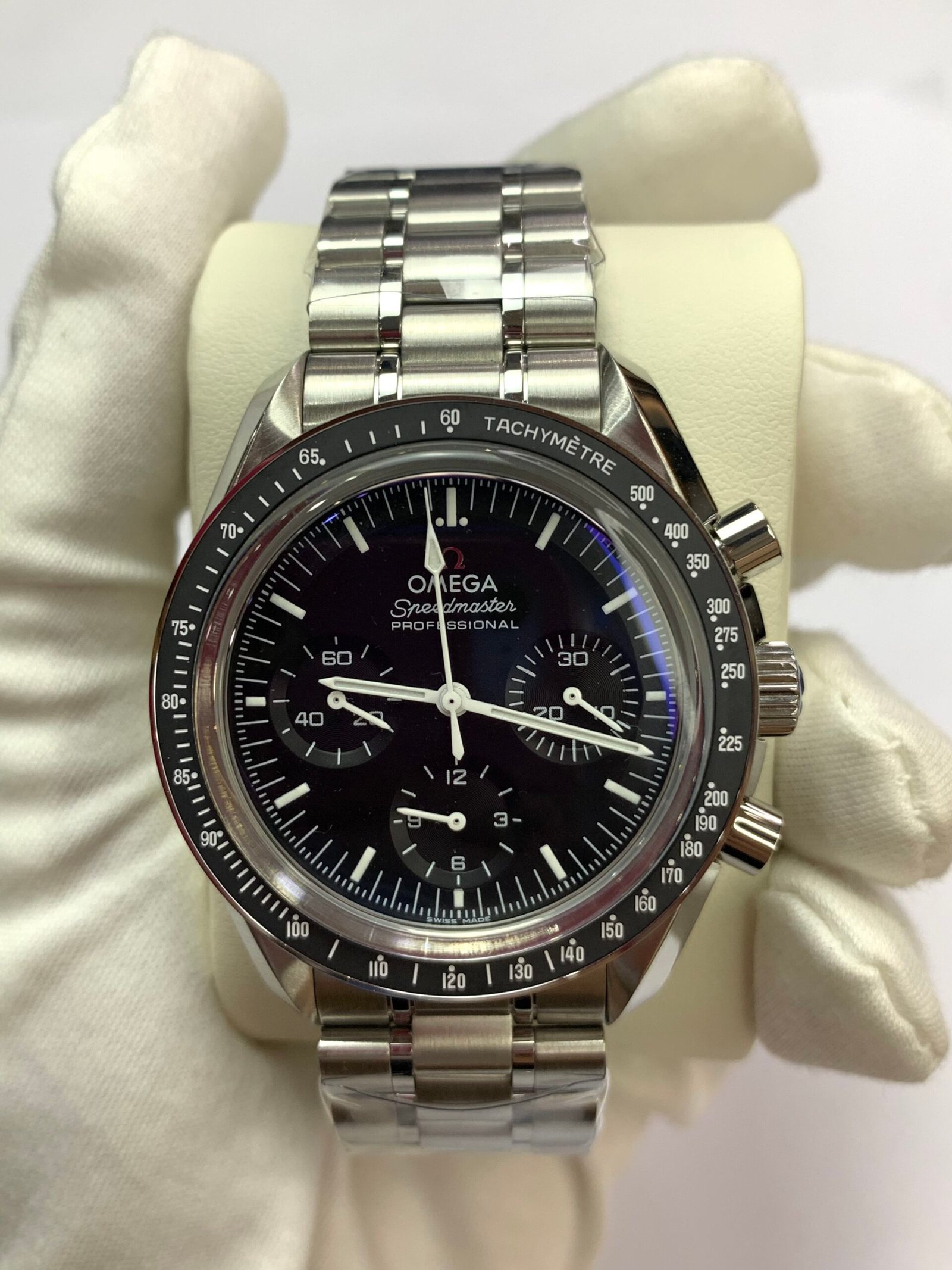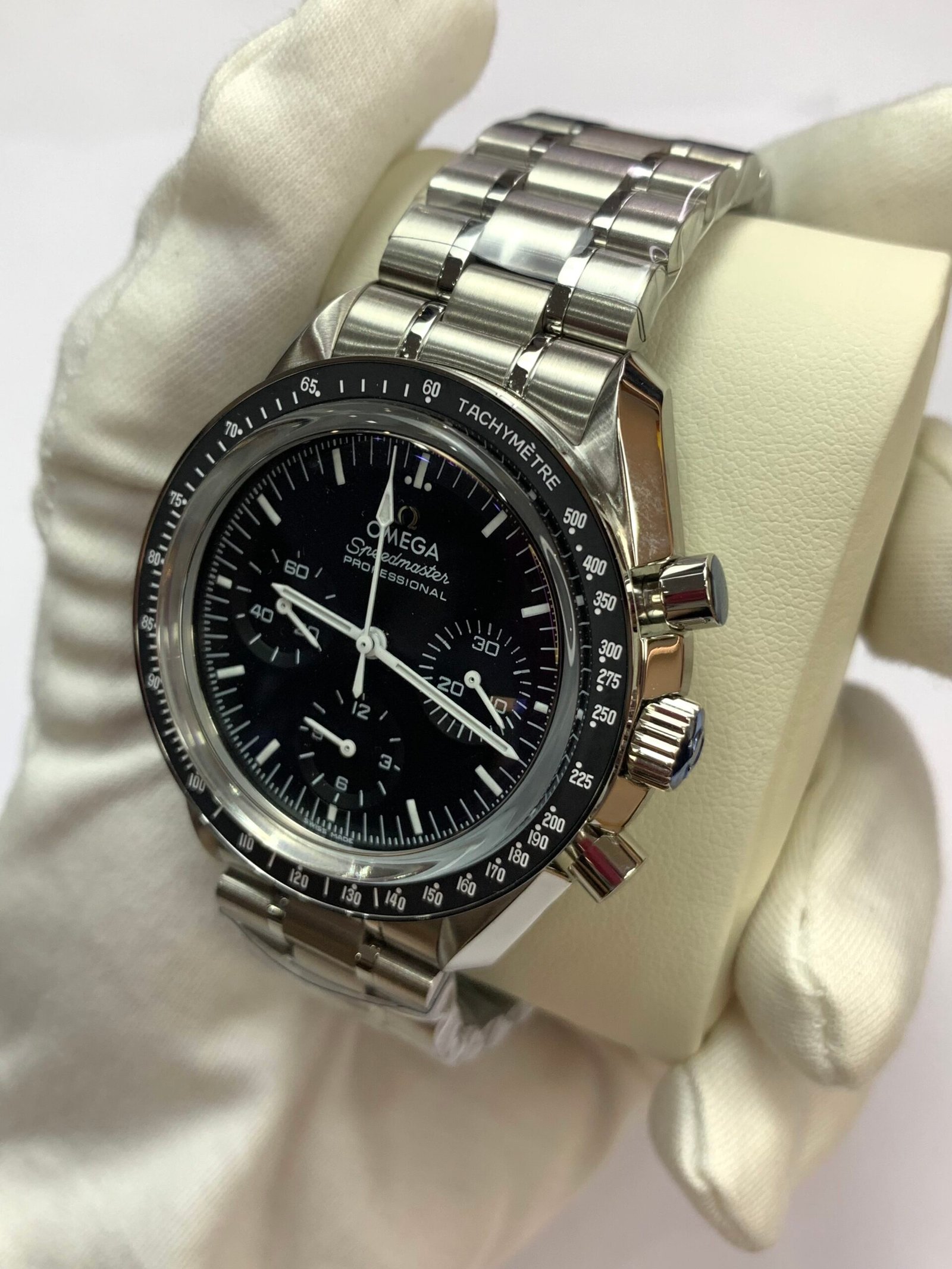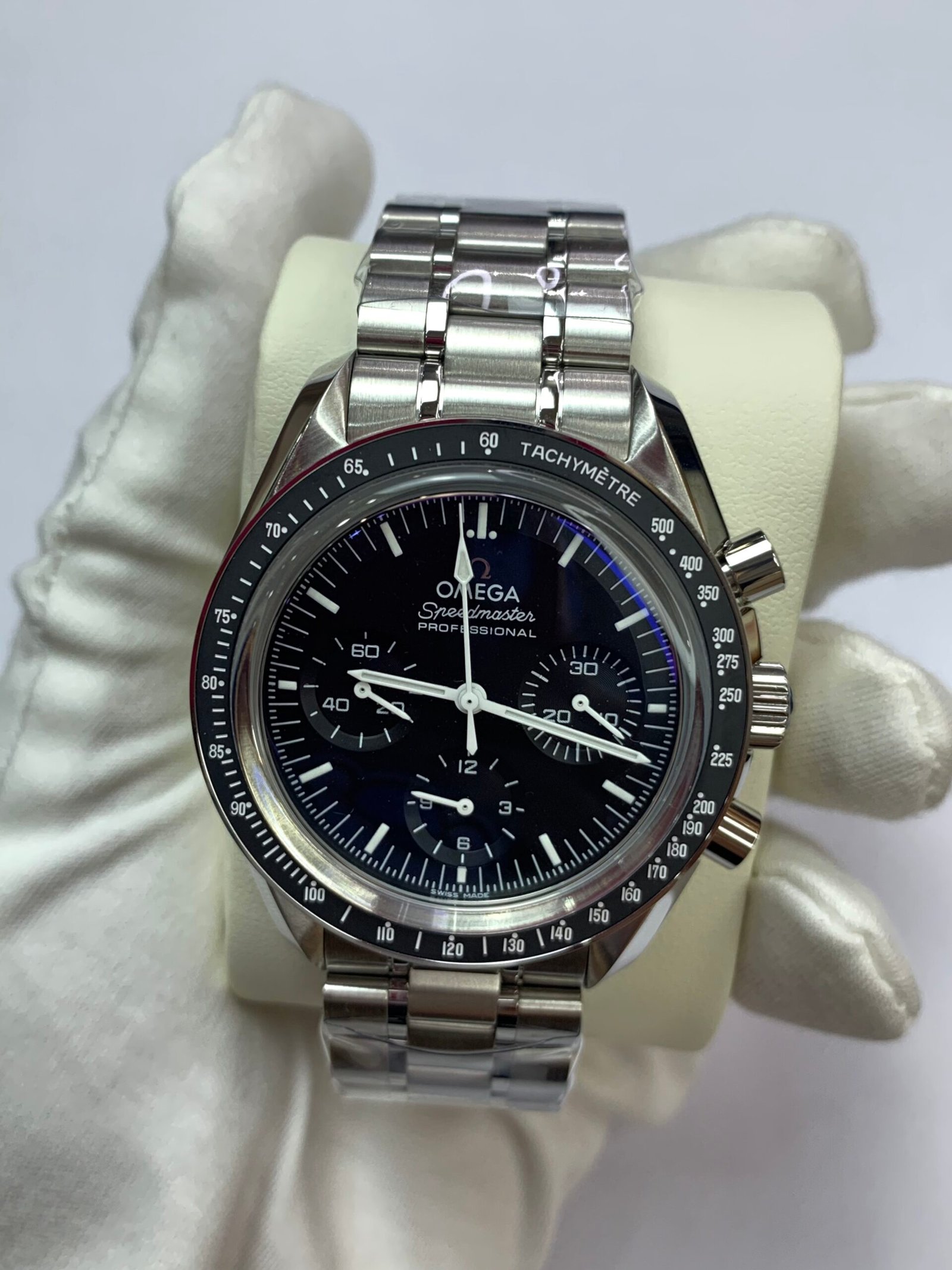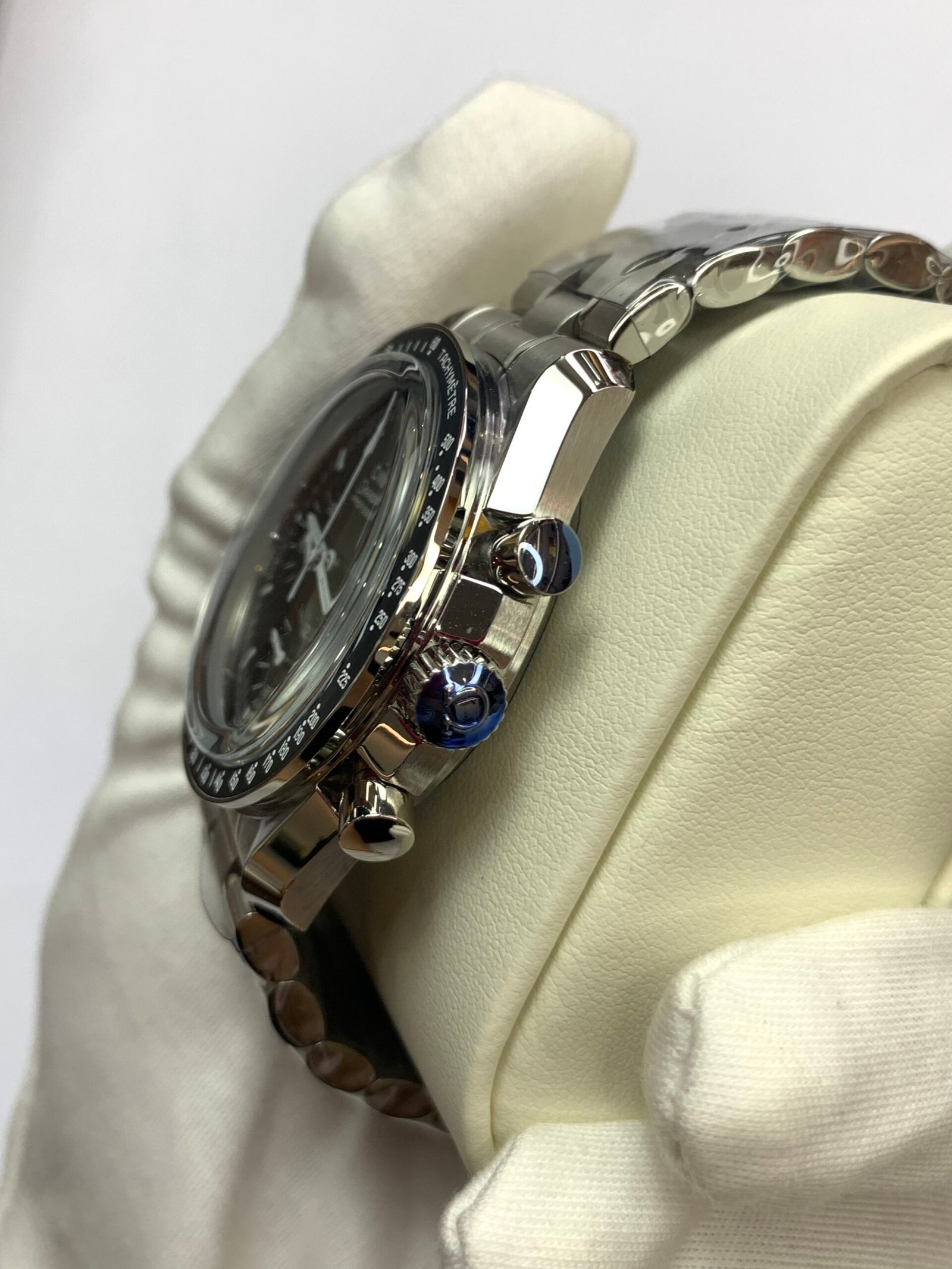 VSF has replicated the legendary 42mm Speedmaster case with exacting precision, capturing the original’s robust yet elegant profileOMEGA®. The lugs feature the correct brushing pattern, while the chronograph pushers offer the iconic “click” feel that has been tested in space. The integrated steel bracelet includes solid end links and the historic Omega folding clasp, providing a secure fit and authentic weight that pays homage to the watch worn on the moon.