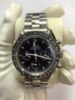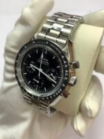 The matte black dial features the classic three-subdial layout (30min at 3, 12hr at 6, small seconds at 9) with applied hour markers and luminous baton hands that glow with Super-LumiNova clarity. VSF has meticulously reproduced the font on the subdial scales and tachymeter bezel to match the genuine 3573.50.00, right down to the Omega logo placement and vintage “Professional” text.