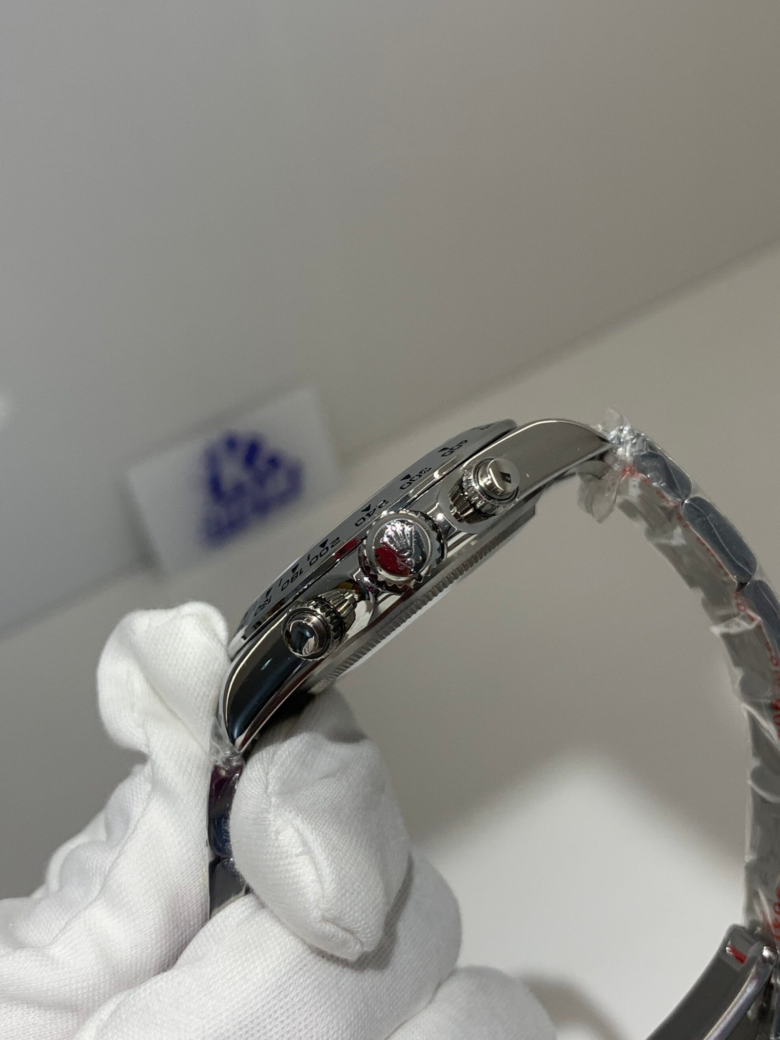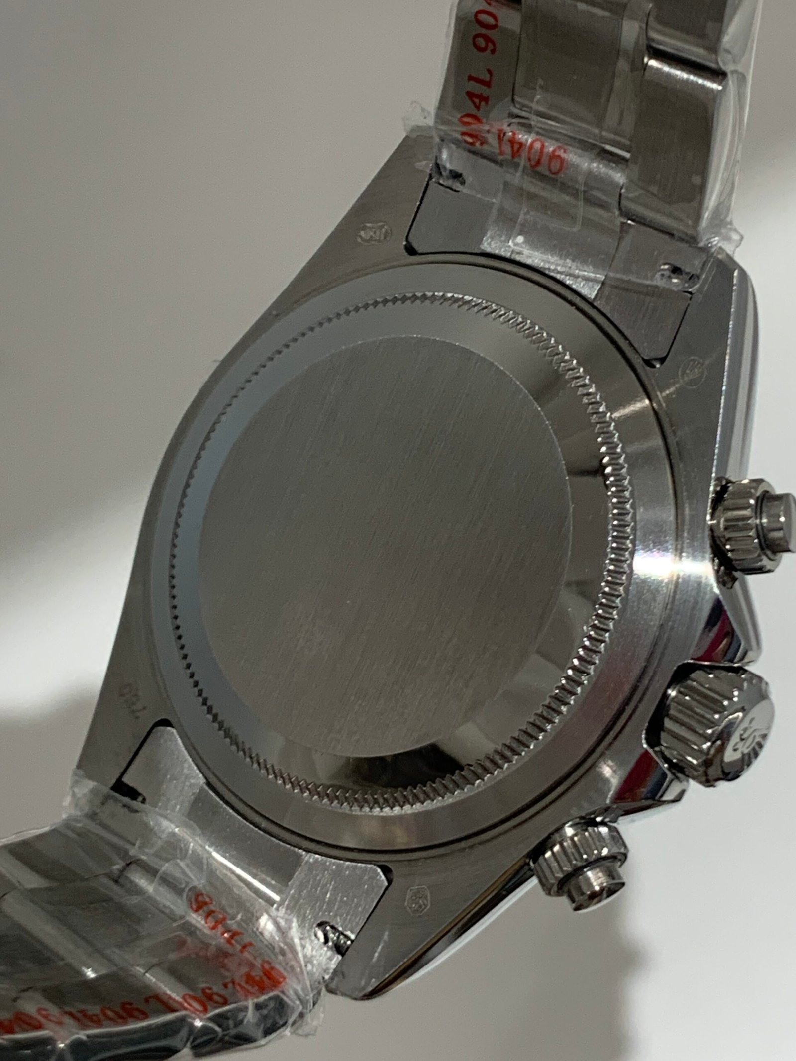 High-brightness polished bezel with sharp, clean engraving. The tachymeter scale is accurately positioned and matches the genuine in font and depth.