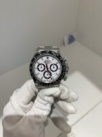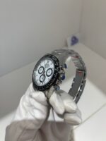 The iconic “Panda” configuration: a crisp white main dial with contrasting black subdials (30min counter at 3H, 12hr counter at 6H, running small seconds at 9H). Applied baton indices and hands are filled with high-intensity Chromalight lume, ensuring perfect legibility day and night.