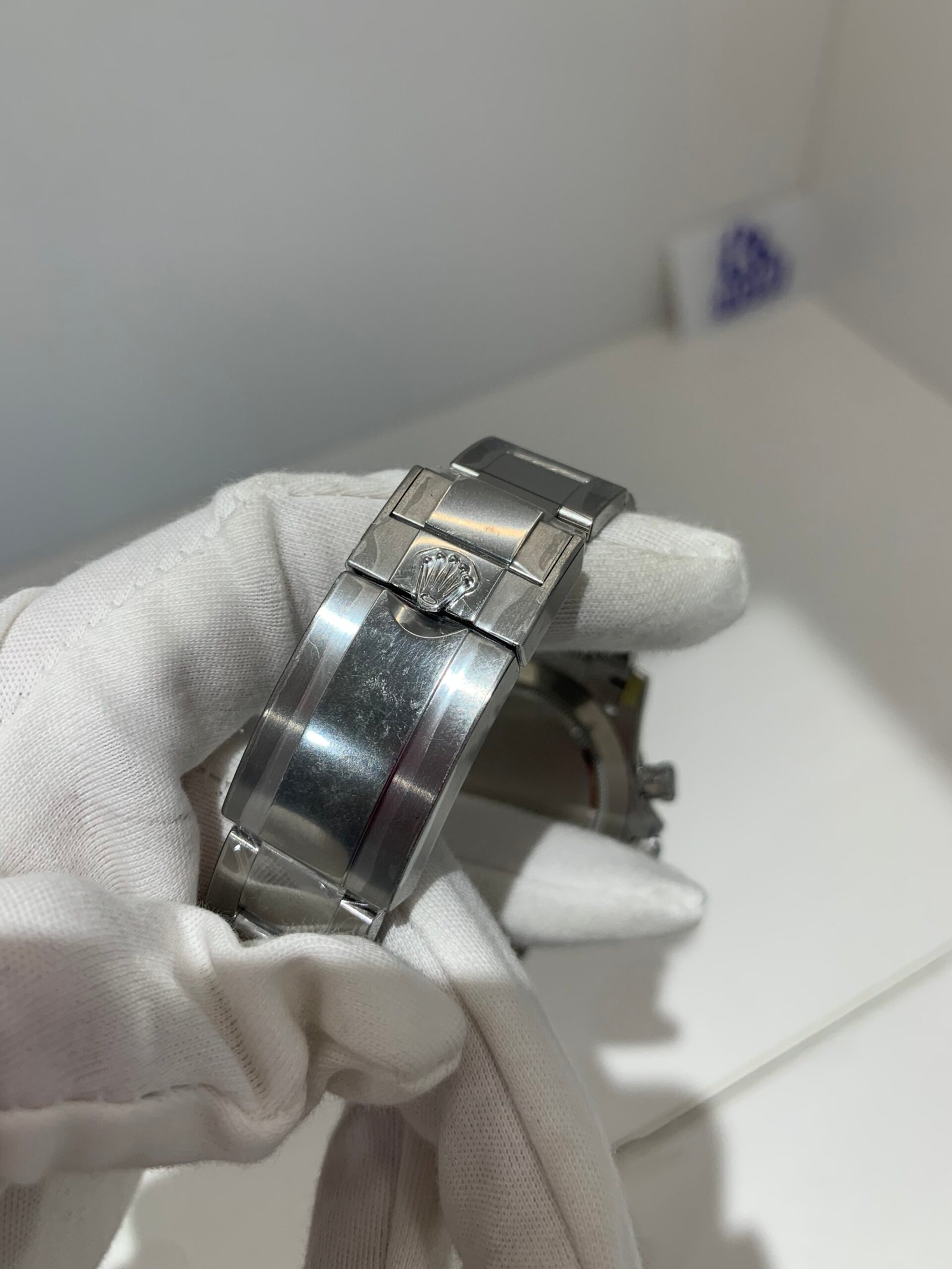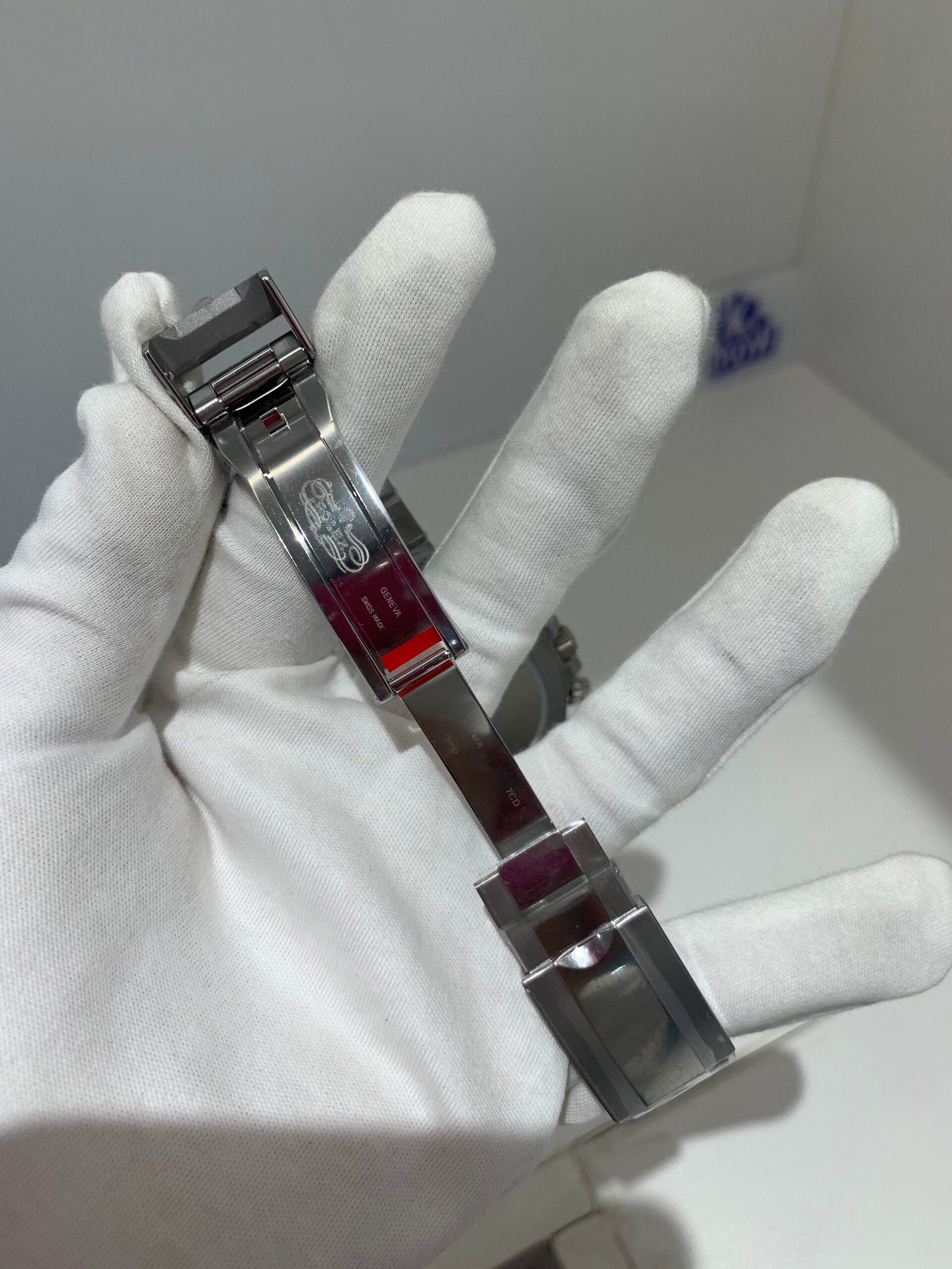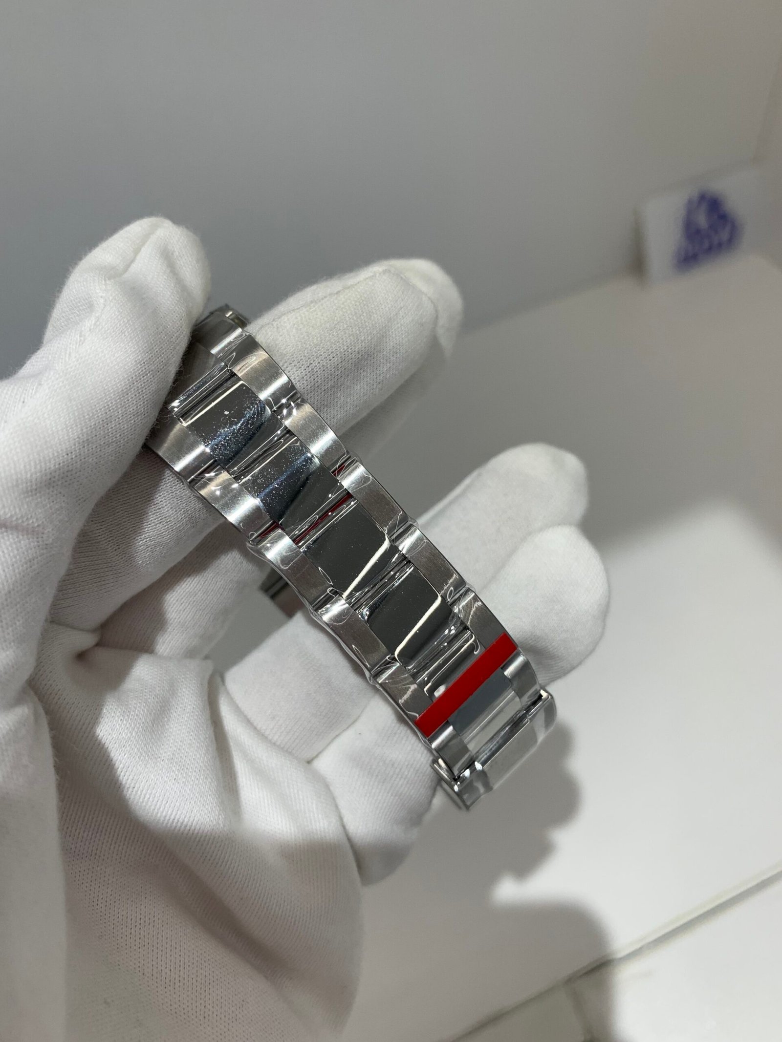 The sapphire crystal is perfectly flat with correct anti-reflective coating—no milky white edge, and sits flush with the bezel at the exact height as genuine. The crystal’s curvature and edge polish are indistinguishable from the original.