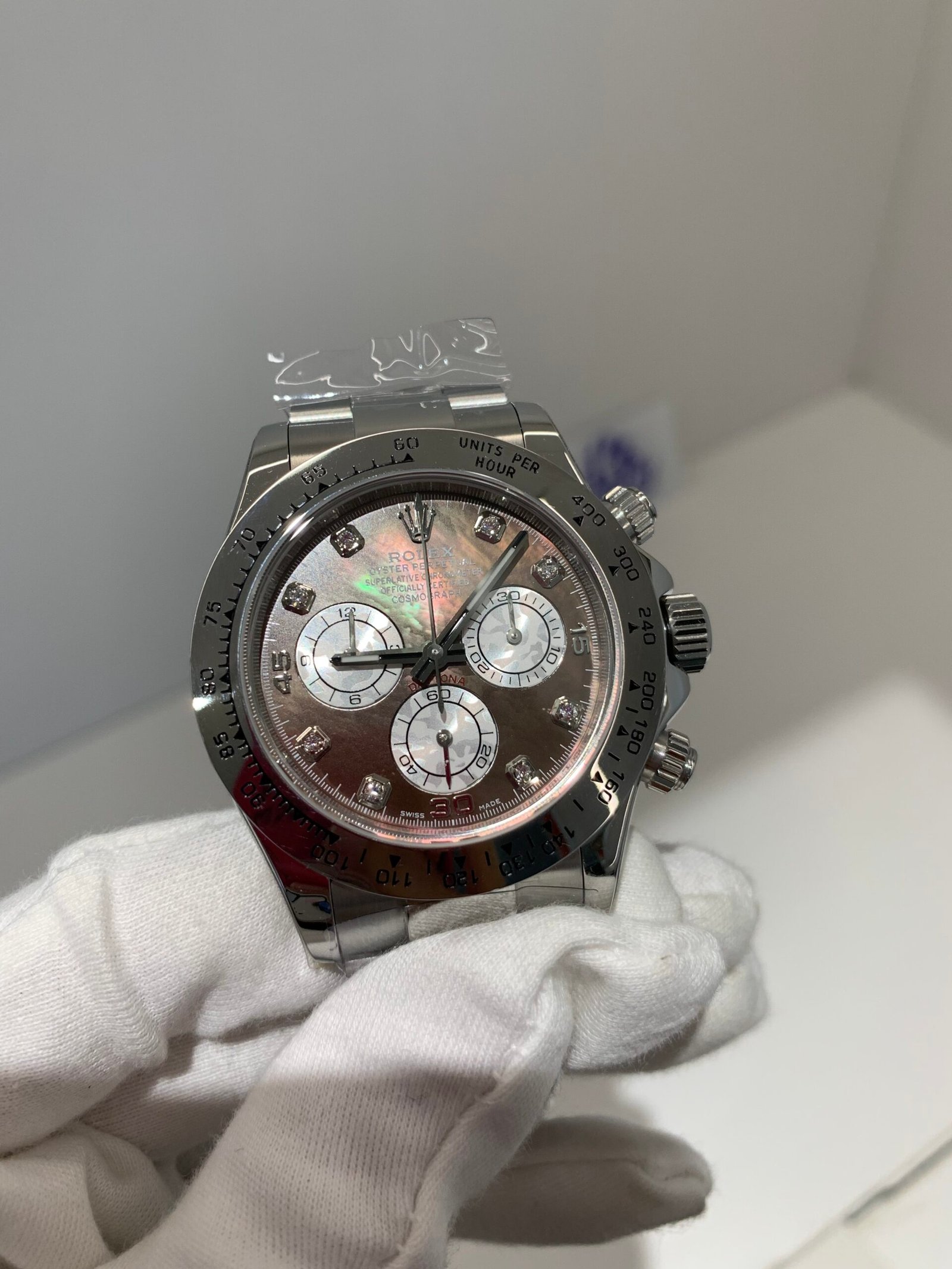 A legendary luxurious sporty chronograph masterpiece powered by the true-to-gen VS4130 movement, delivering flawless chronograph functionality and featuring the unique meteorite dial with black sub-dials, paired with a polished 18K white gold case/bezel and Oyster bracelet that embodies Rolex Daytona’s racing heritage and precious metal luxury.