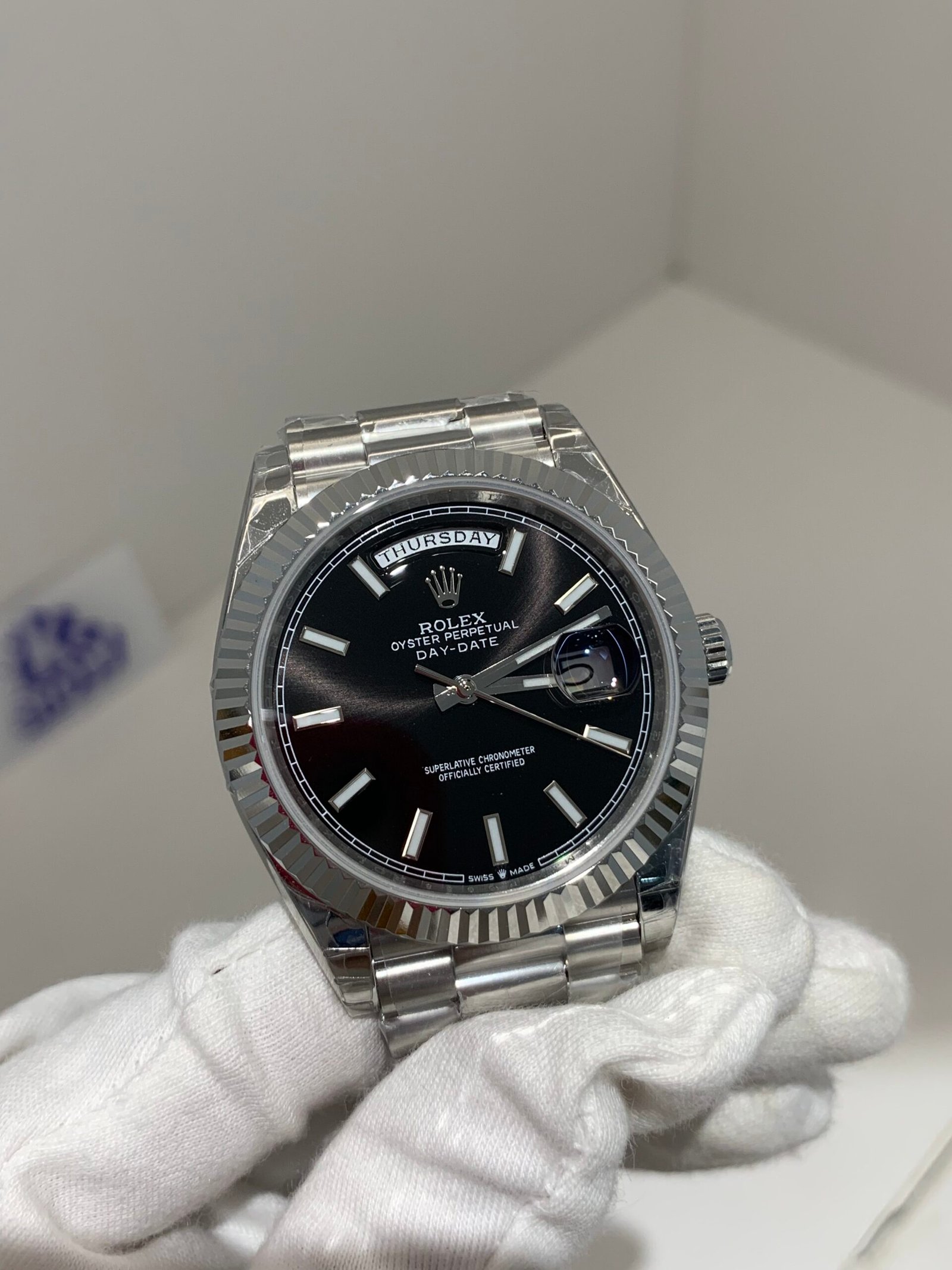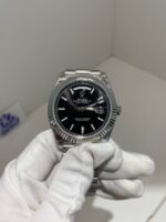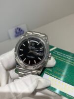 VSF’s case craftsmanship remains unmatched. The 40mm case is precision‑machined from solid 904L stainless steel, with a multi‑layer platinum plating replicating the cool luster of 18k white gold. The signature fluted (triplock) bezel is mirror‑polished to perfection, and the President bracelet features solid, seamless links with a flawless taper, delivering an identical feel and weight (≈182g) to the genuine article on the wrist.