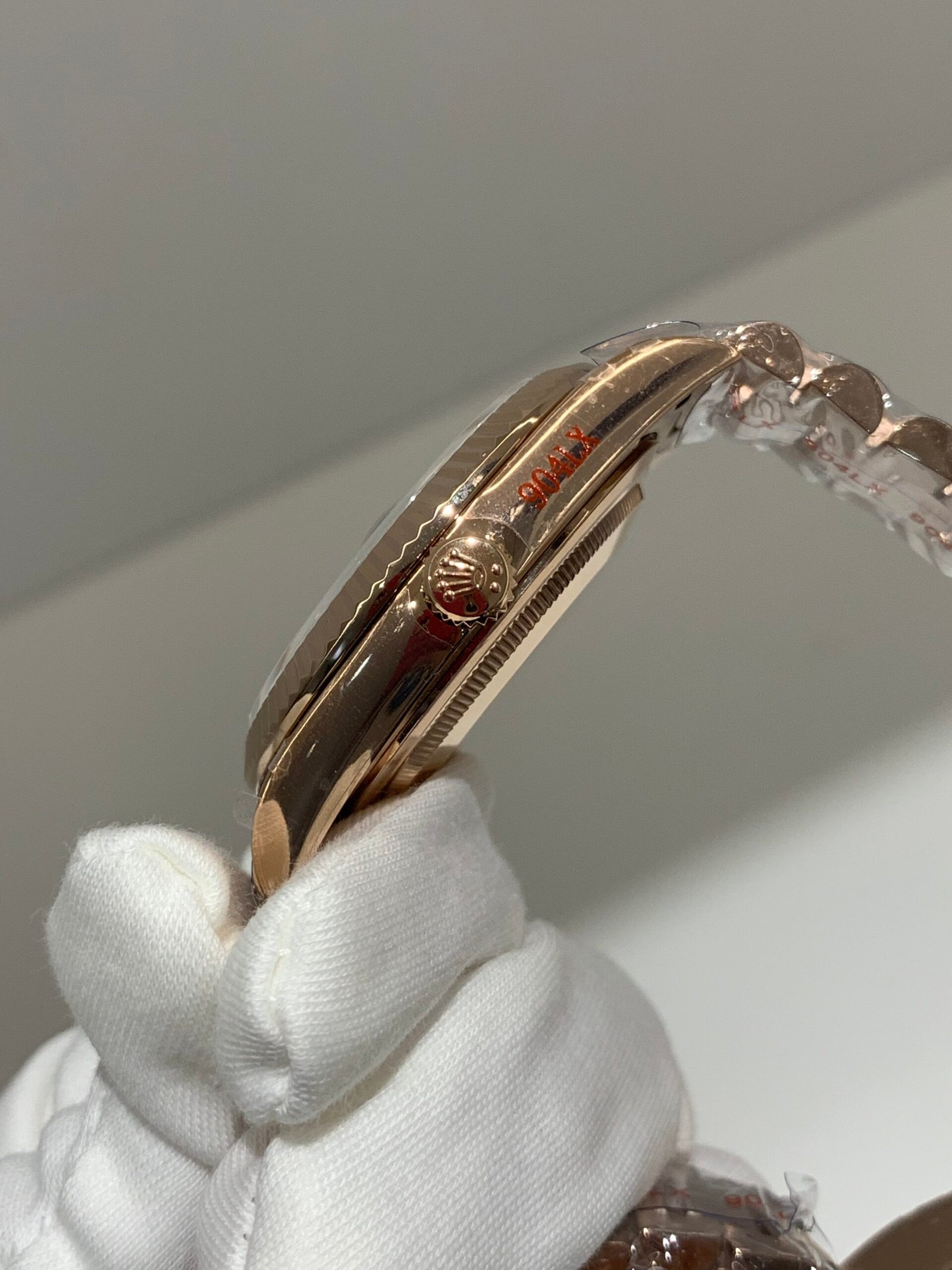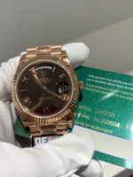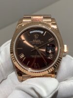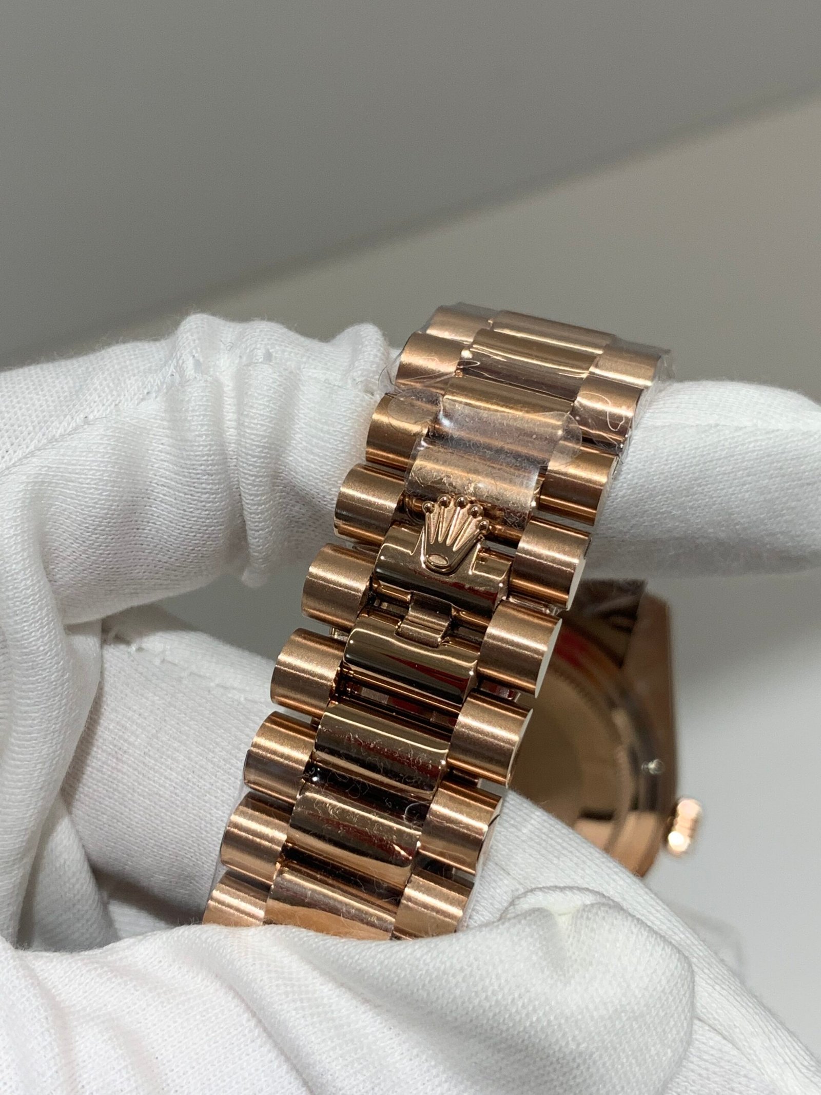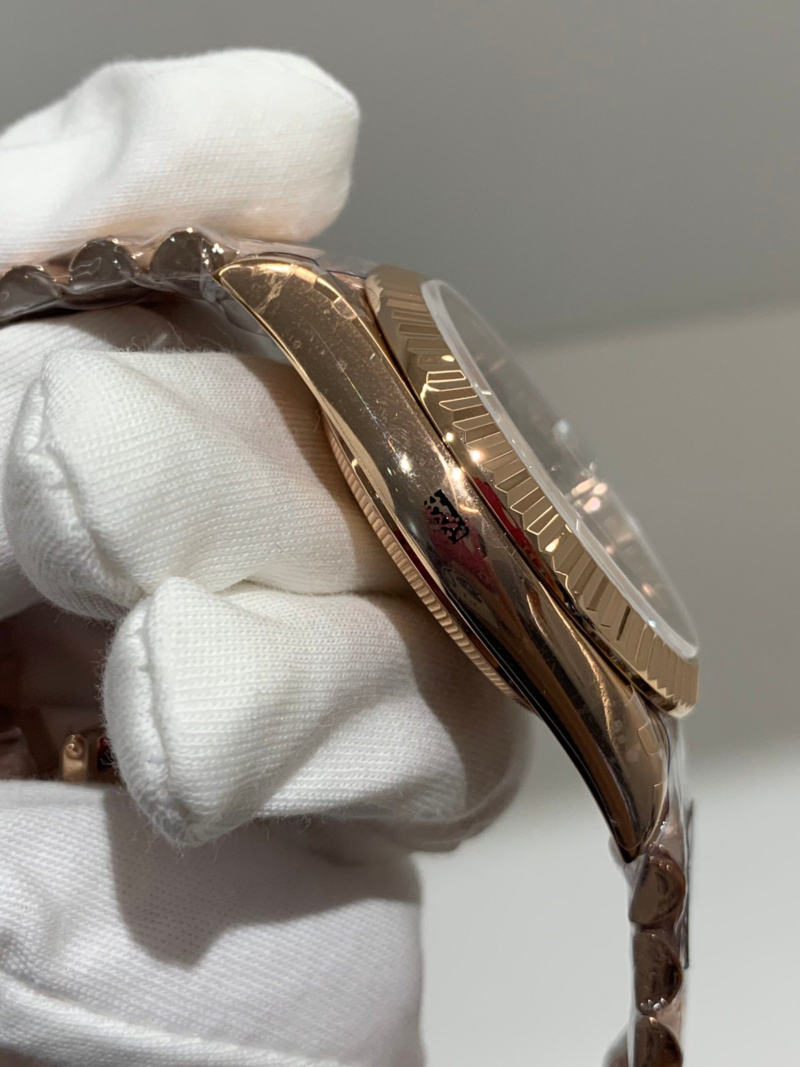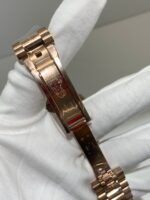Polished 18K Everose Gold Fluted Bezel A classic fluted bezel crafted from 18K Everose gold, perfectly polished to a mirror shine—an iconic Rolex signature exclusive to Day-Date models. It frames the smoky green dial without distraction and maintains the correct curvature relative to the mid-case, embodying the genuine’s distinguished and modern design.