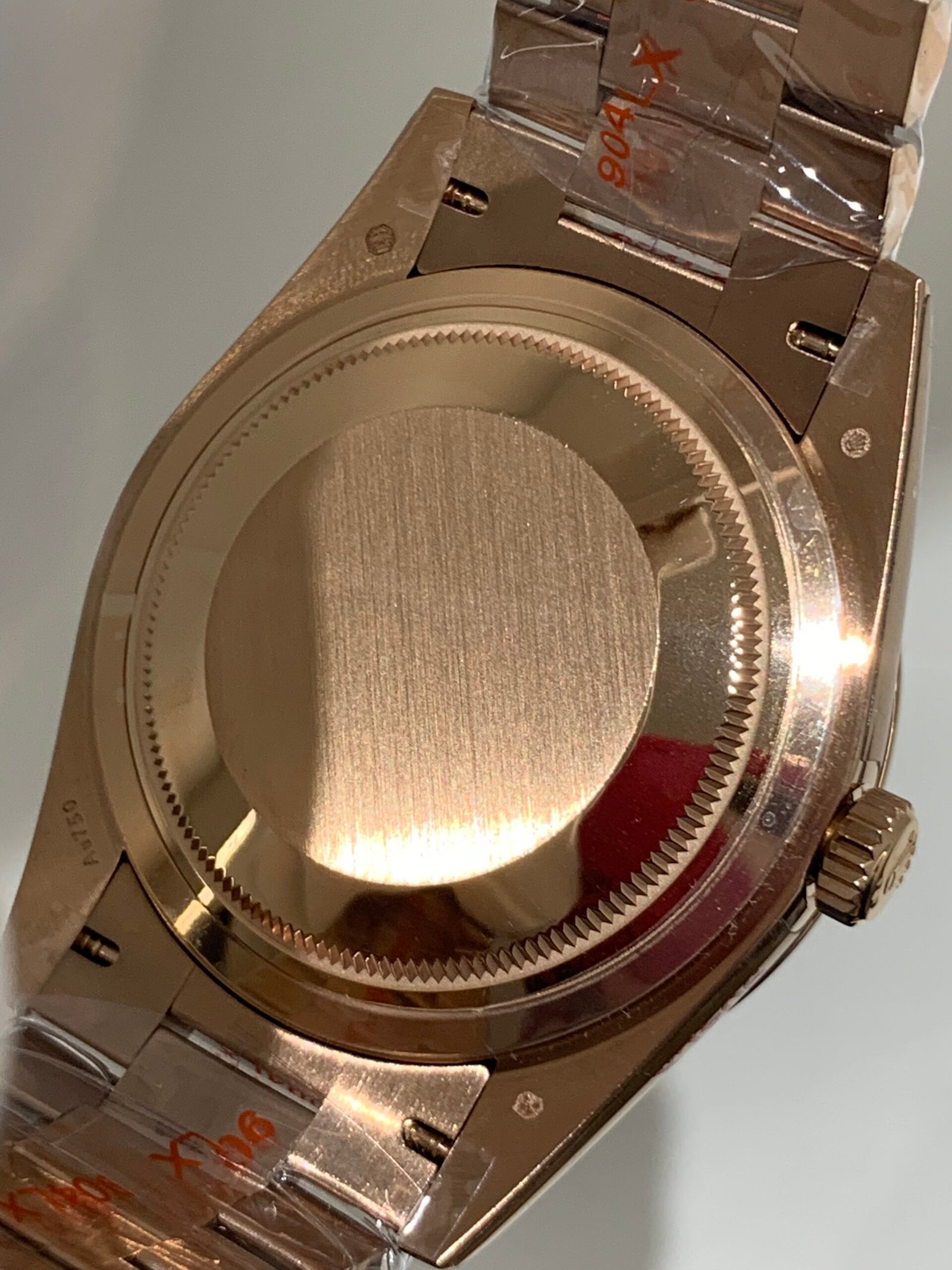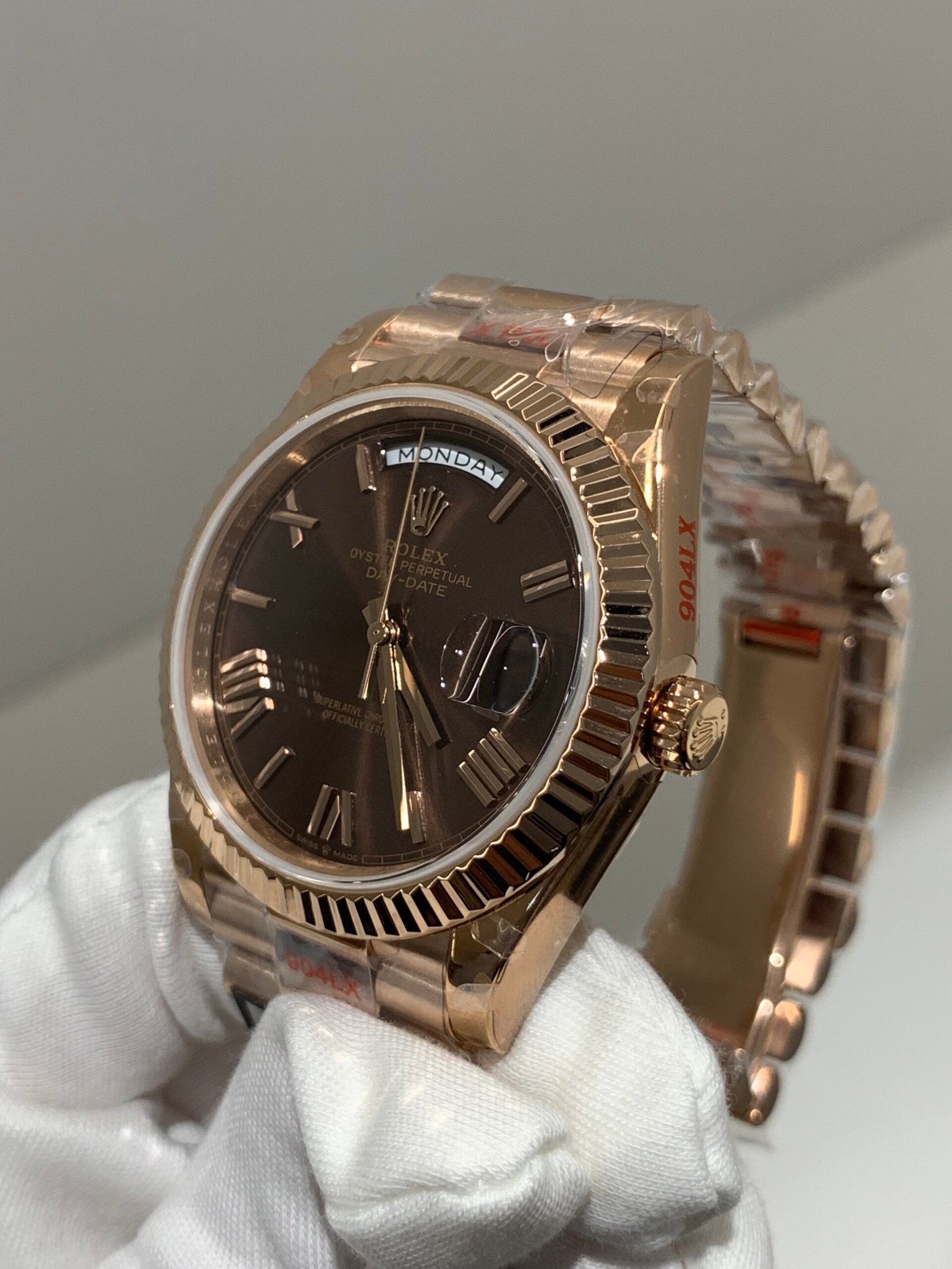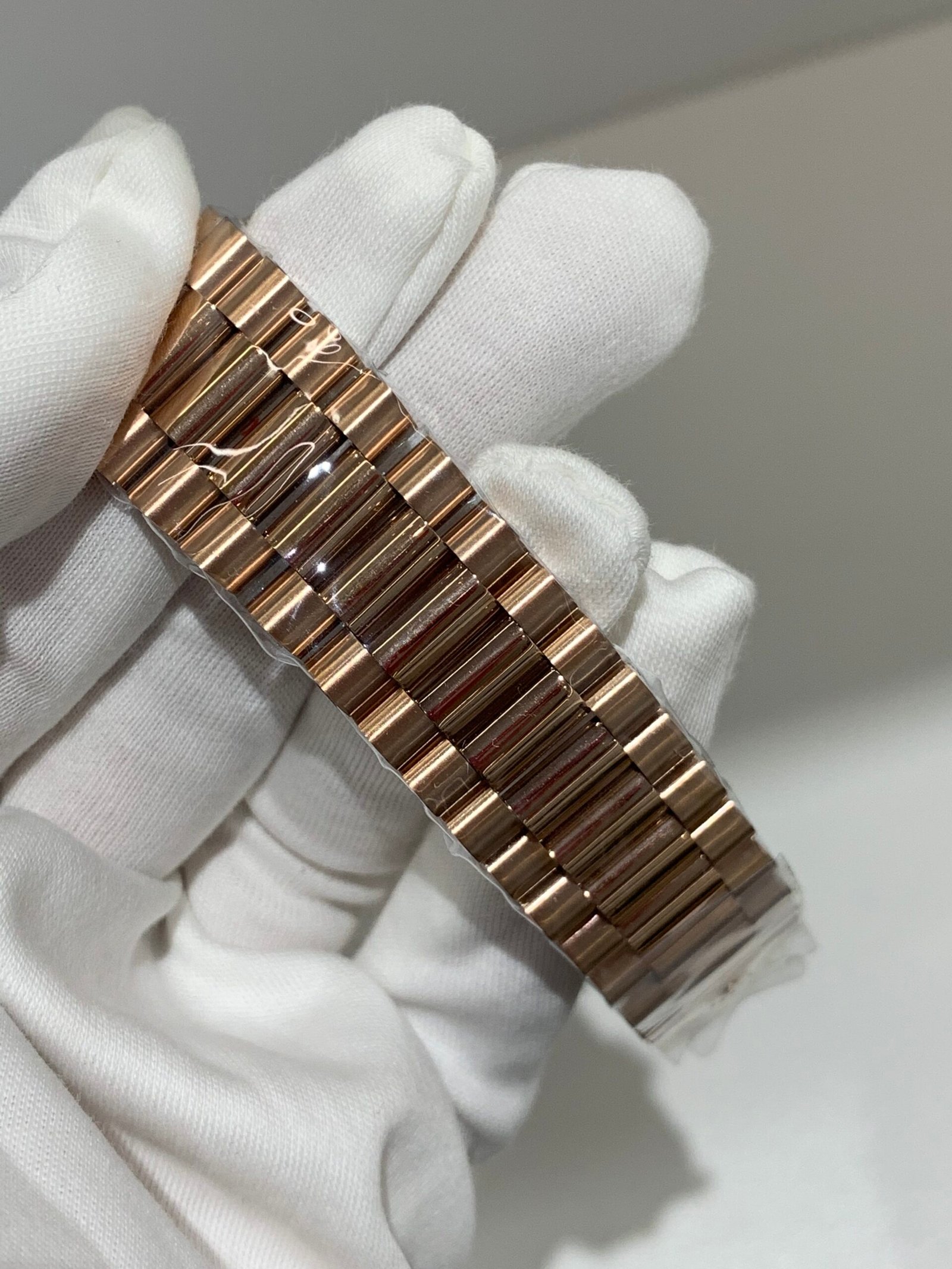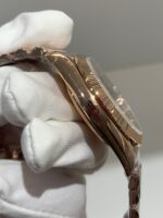 18K Everose Gold Finish VSF continues its dominance in case machining. Crafted entirely from 18K Everose gold—true to the genuine Day-Date’s all-precious-metal tradition—the case and President bracelet feature industry-leading polishing and brushing, with a buttery smooth President bracelet taper that feels identical to the genuine article on the wrist, embodying the model’s warm luxury and comfortable wearing experience.