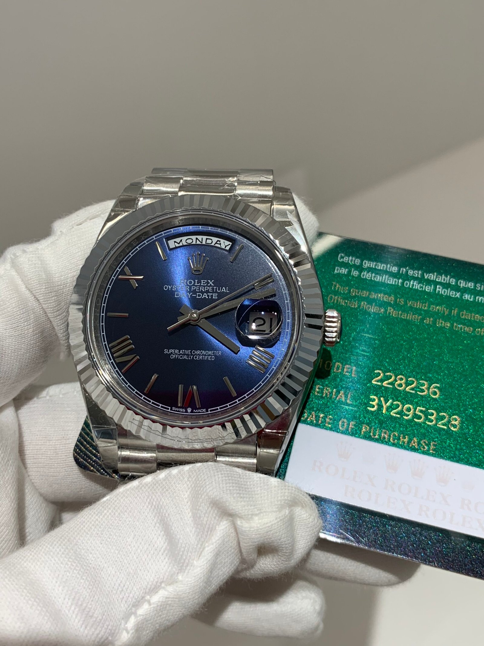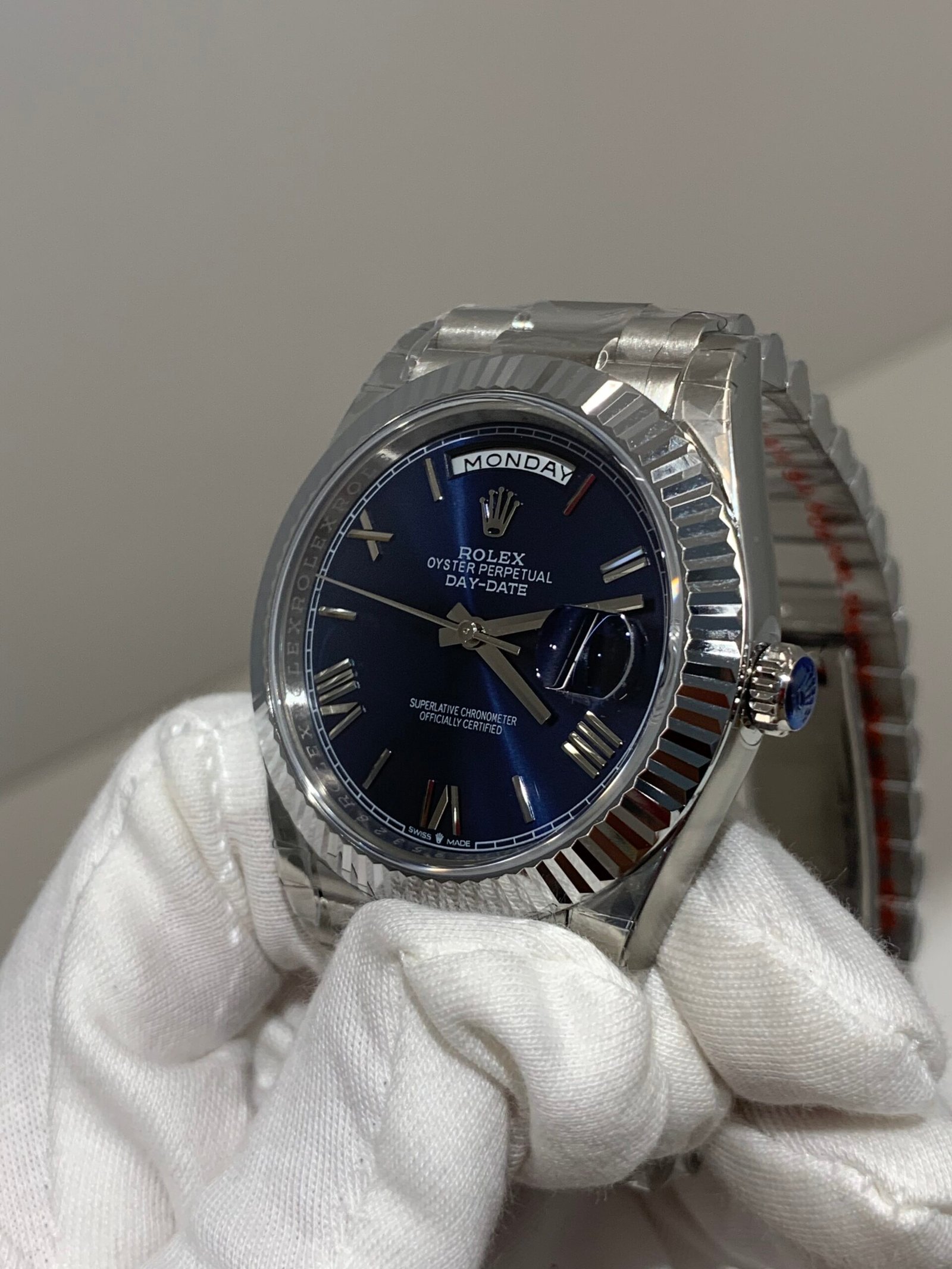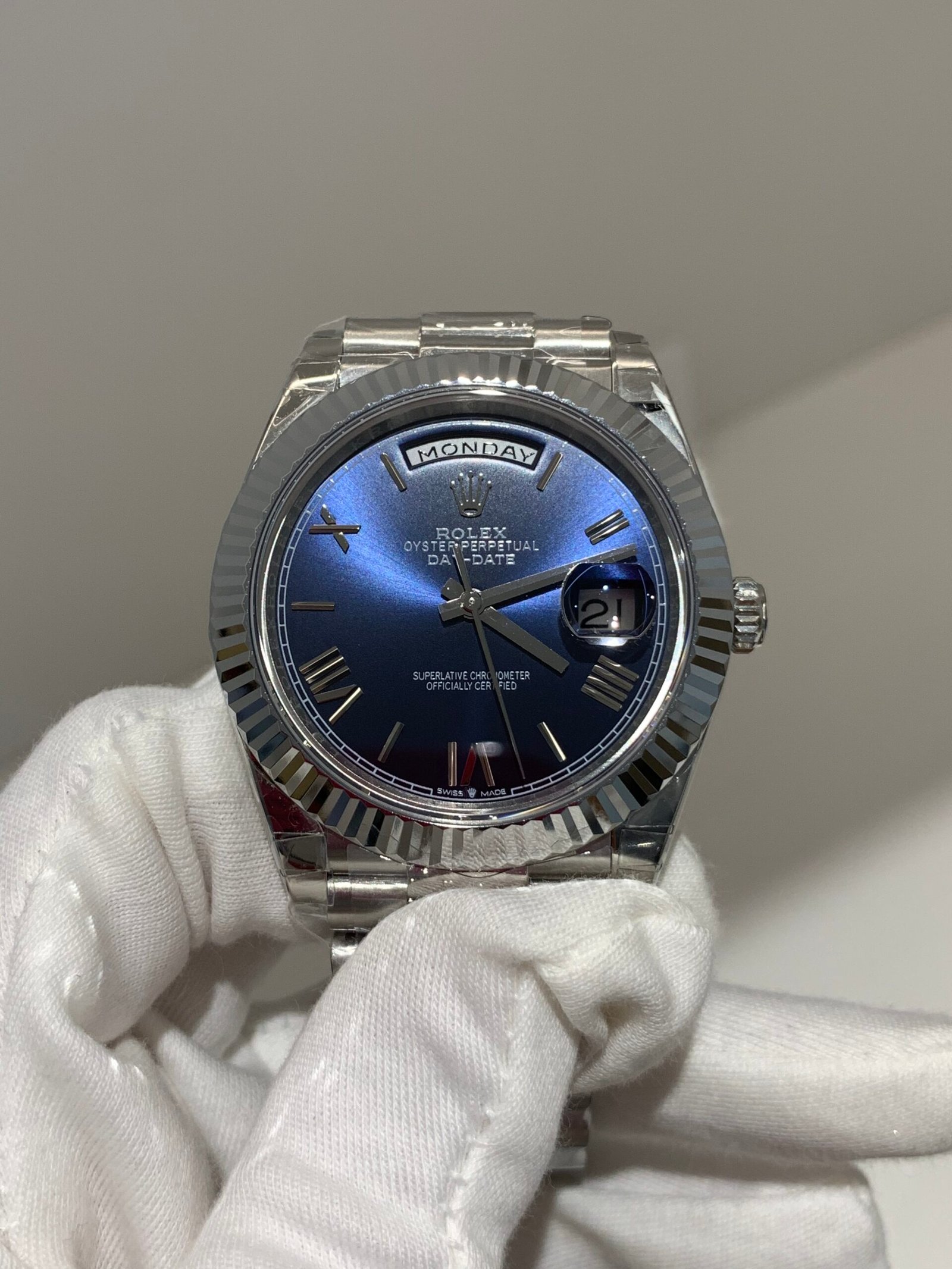 An ultra‑luxury status symbol in 40mm platinum, featuring the iconic fluted bezel, stunning blue ombré dial with Roman numerals, and the genuine‑matching VS3255 Super Clone movement—zero ghost functions, instant day/date, rapid setting, authentic feel and 70‑hour power reserve.