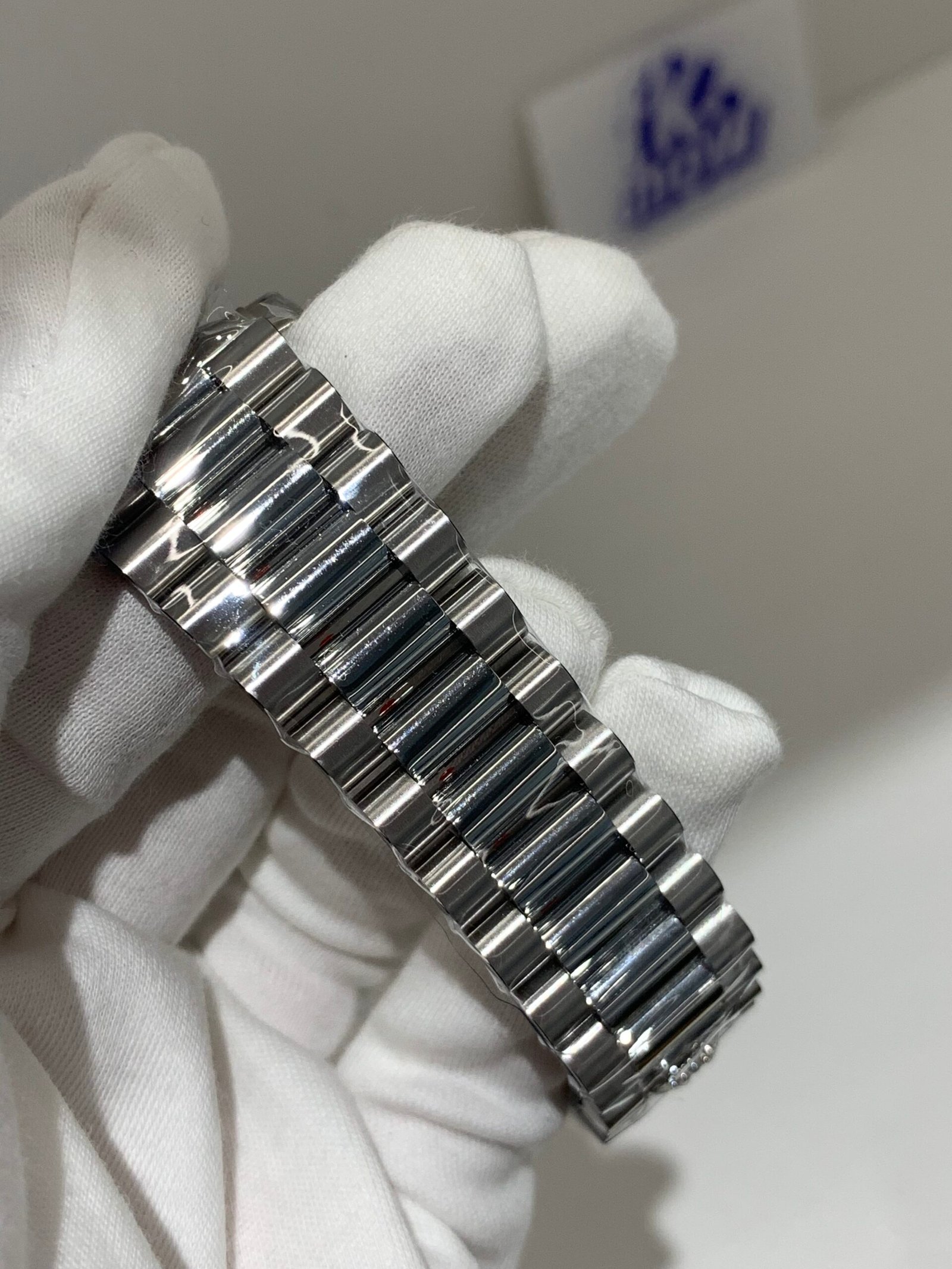 950 Platinum 40mm Oyster Case. VSF’s master‑level machining: perfectly polished fluted bezel, crisp brushing on the lugs, solid end links for the President bracelet, and Twinlock double‑waterproof screw‑down crown with deep engravings. Monobloc middle case, screw‑down case back for 100m water resistance.