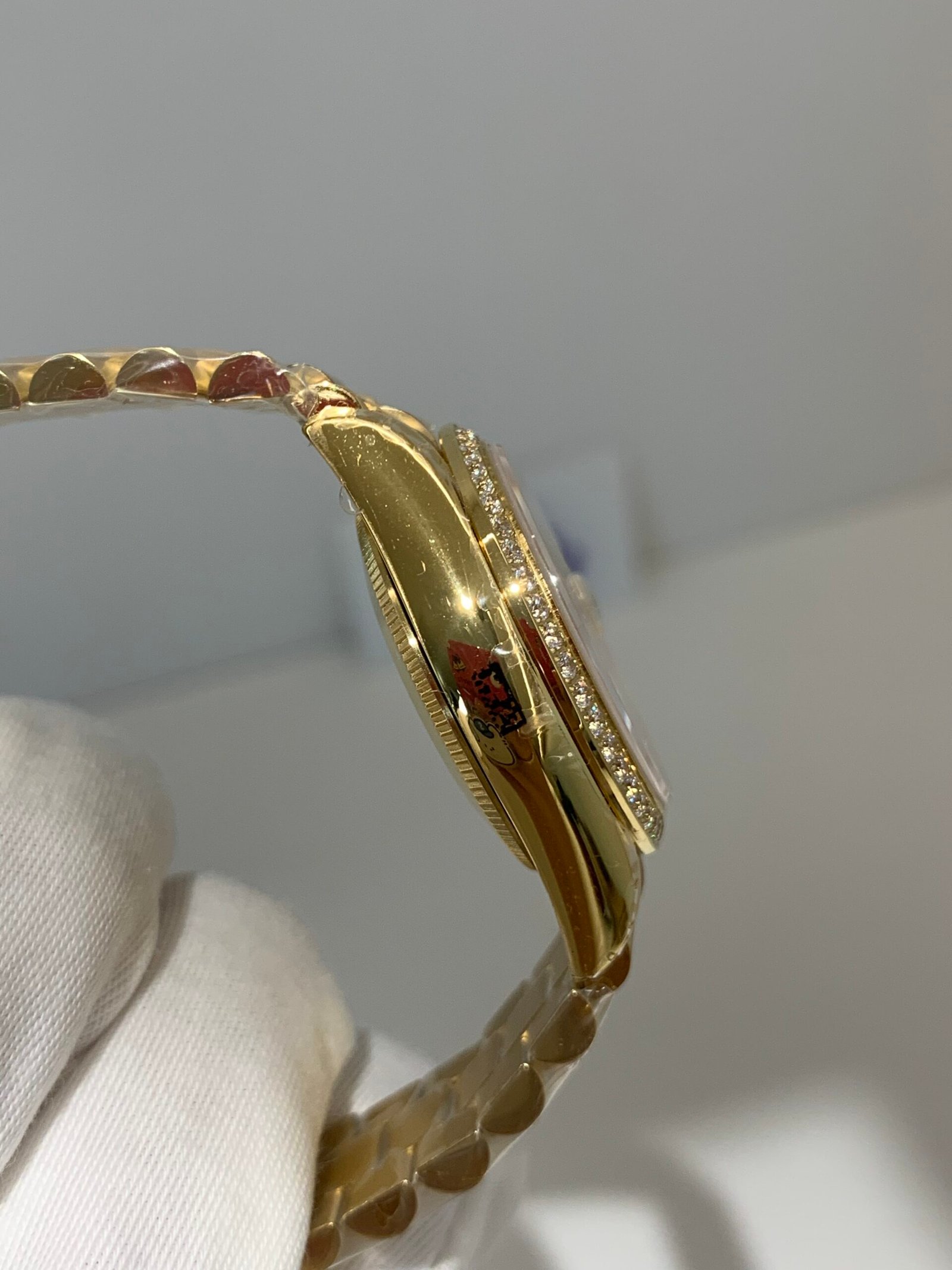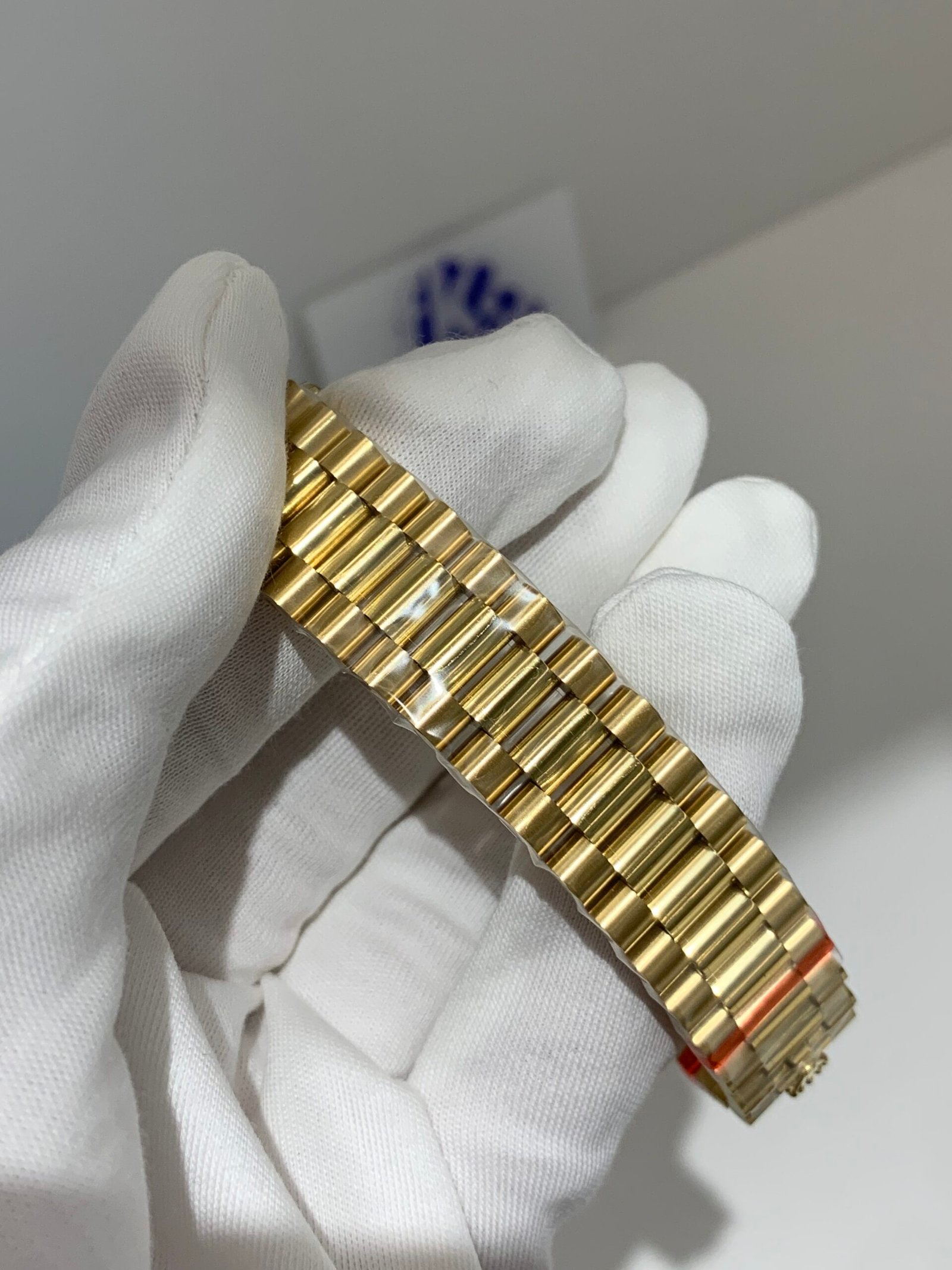 Polished 18K Everose Gold Fluted Bezel A classic fluted bezel crafted from 18K Everose gold, perfectly polished to a mirror shine—an iconic Rolex signature exclusive to Day-Date models. It frames the mother-of-pearl dial without distraction and maintains the correct curvature relative to the mid-case, embodying the genuine’s distinguished and modern design.