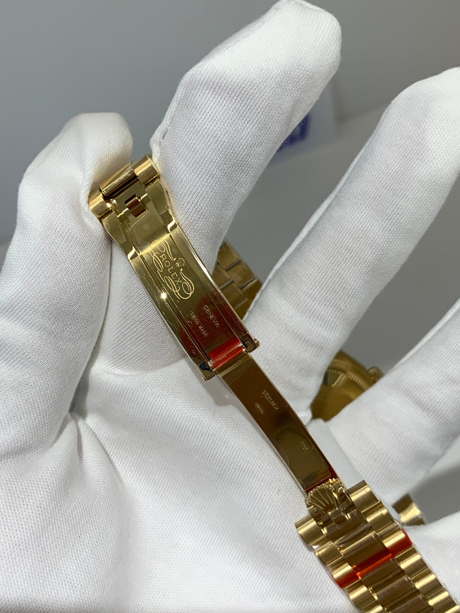 18K Everose Gold Finish VSF continues its dominance in case machining. Crafted entirely from 18K Everose gold—true to the genuine Day-Date’s all-precious-metal tradition—the case and President bracelet feature industry-leading polishing and brushing, with a buttery smooth President bracelet taper that feels identical to the genuine article on the wrist, embodying the model’s warm luxury and comfortable wearing experience.
