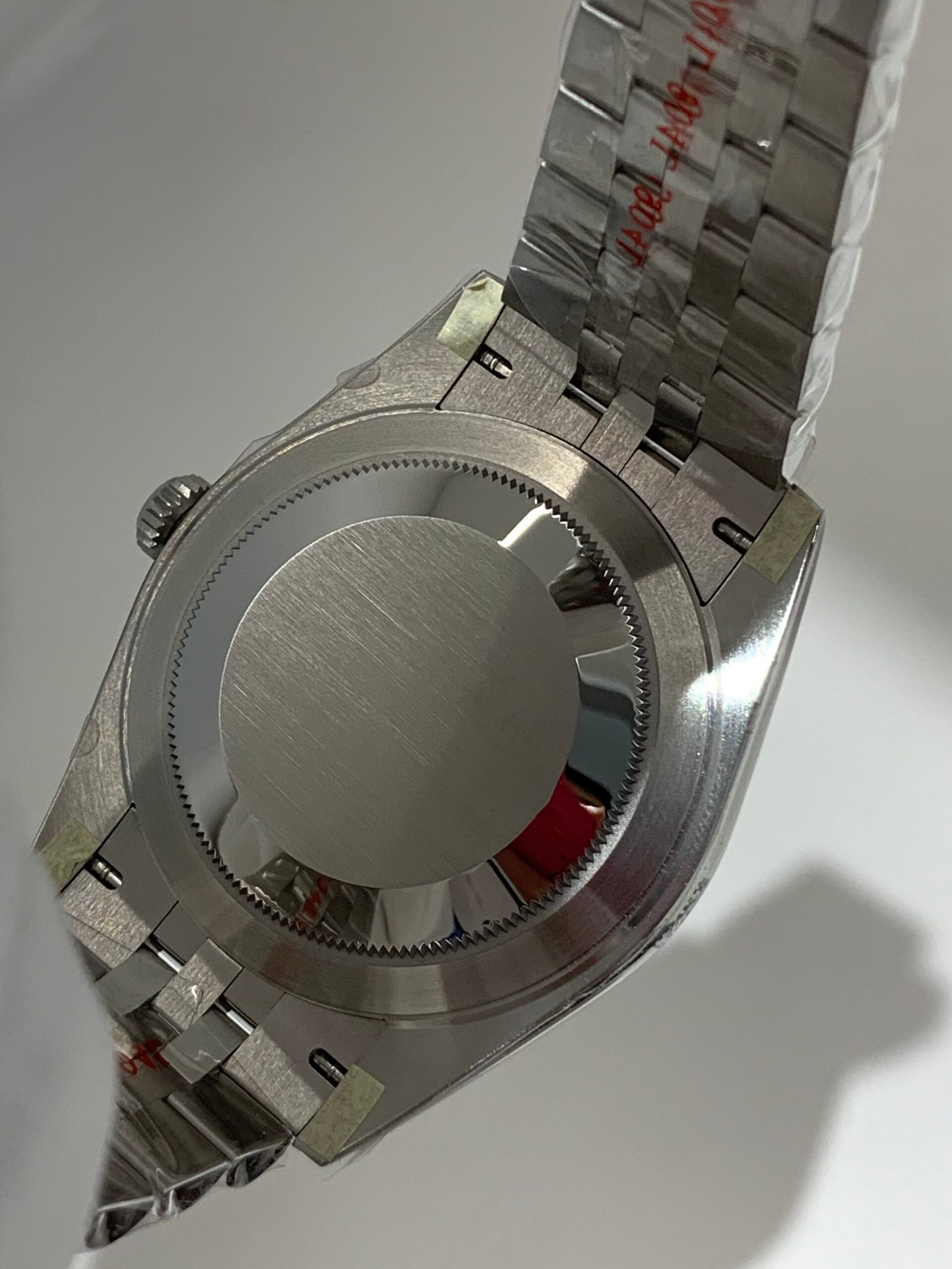 Polished Domed Steel Bezel A classic smooth domed bezel crafted from 904L Oystersteel, perfectly polished to a mirror shine. It frames the silver sunburst dial elegantly without distraction and maintains the correct curvature relative to the mid-case, matching the genuine’s proportions exactly, and highlighting the pure steel build’s timeless appeal.