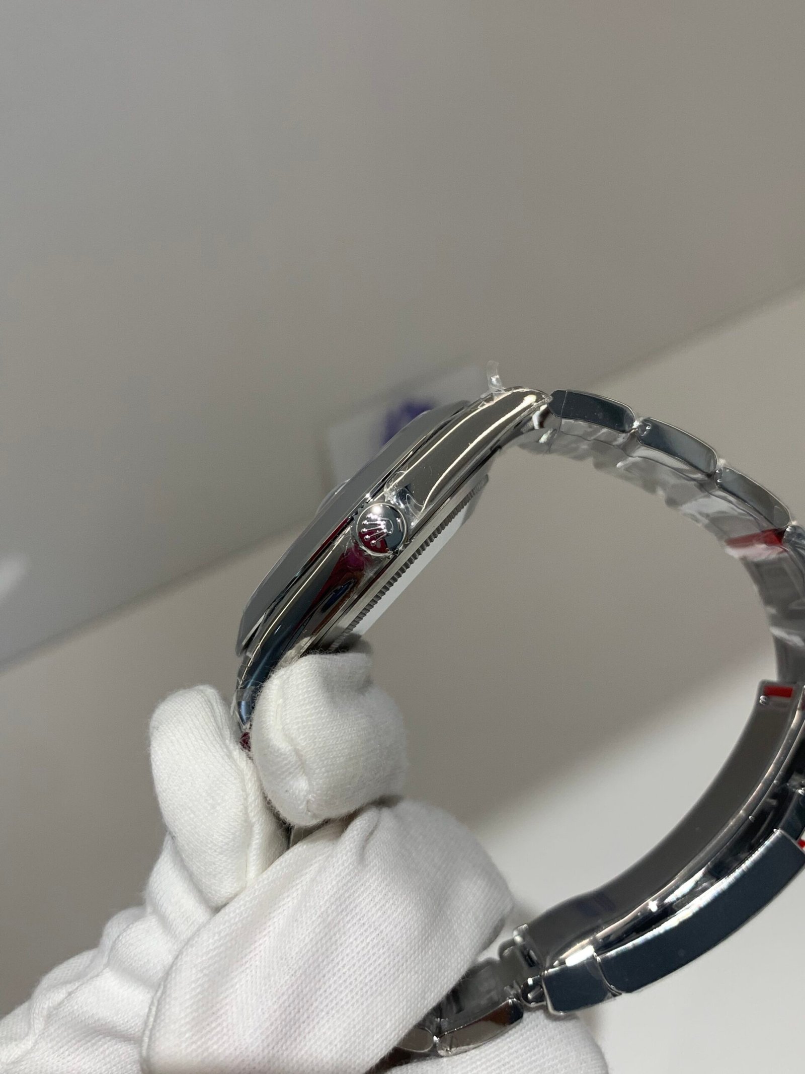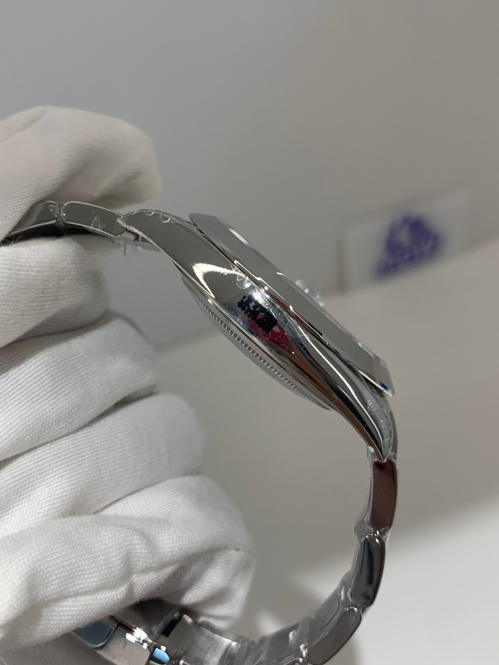 Crystal Clarity VSF is unrivaled in crystal production. The sapphire is incredibly clear, with no milky ring effect (white edge) and correct internal AR coating, making the champagne sunburst dial pop in any lighting. The crystal’s domed shape and date magnifier are true to genuine, with precise edge polishing, ensuring optimal readability in all environments.