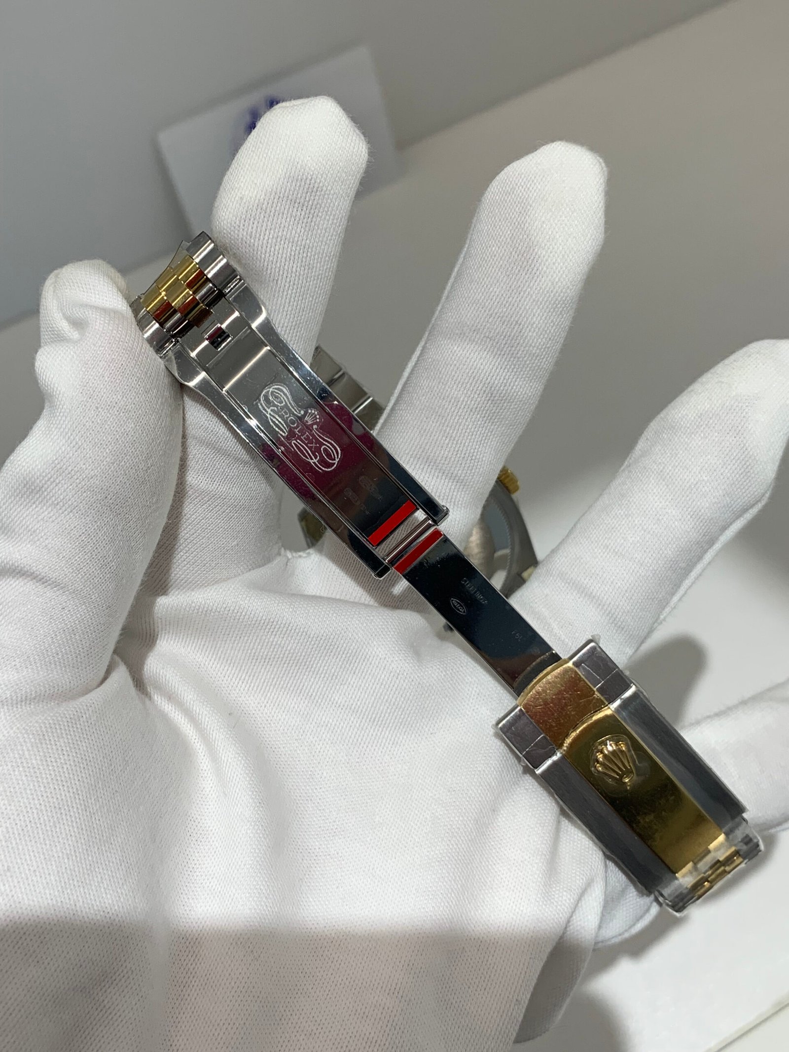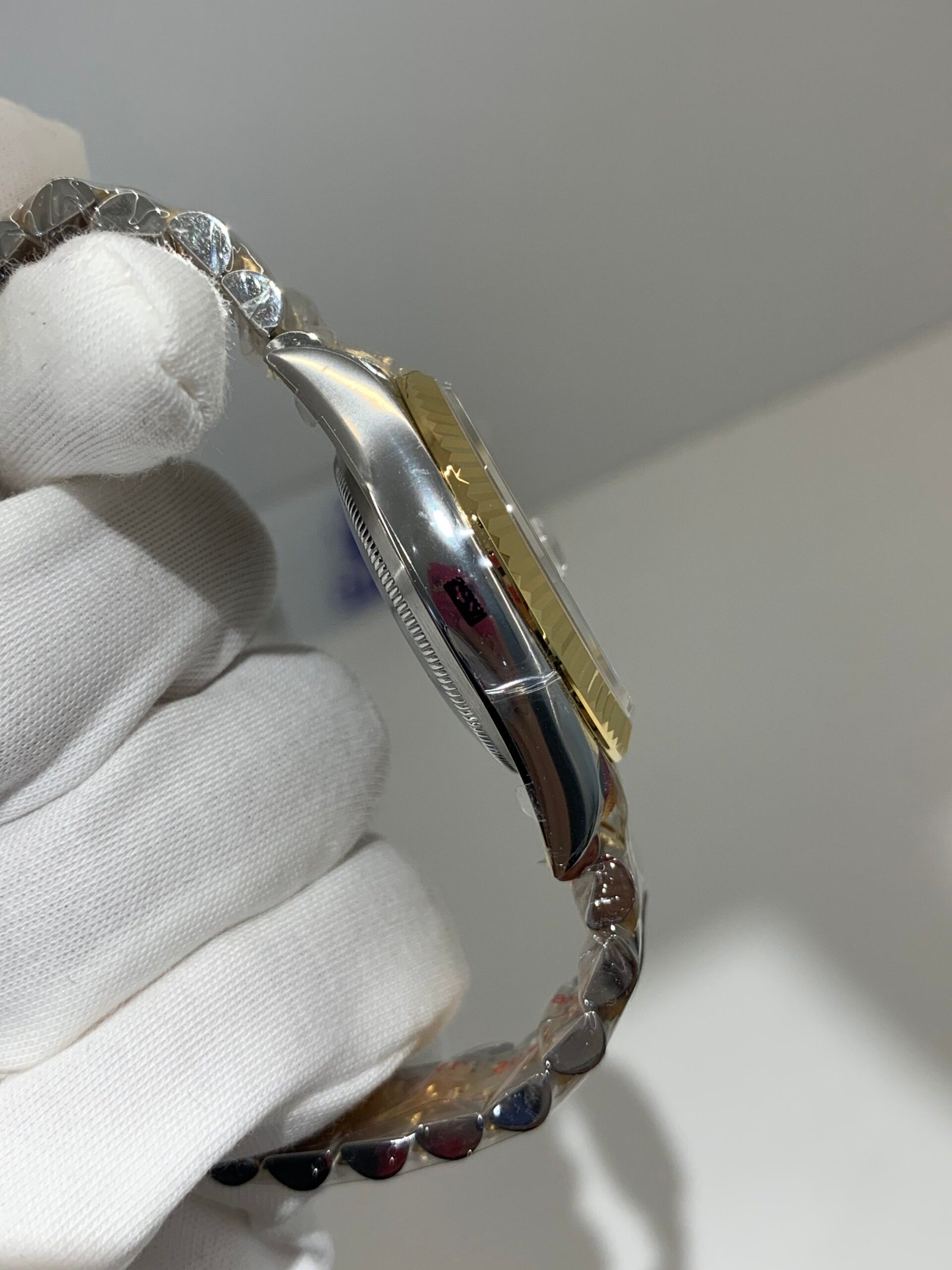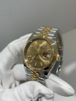 18K Yellow Gold & 904L Oystersteel Finish VSF continues its dominance in case machining. The combination of 18K yellow gold (warm, radiant tone, true to genuine) and 904L stainless steel—known as Yellow Rolesor, a iconic Rolex blend of luxury and strength—features industry-leading brushing on the steel lugs and polished yellow gold accents. The 904L Oystersteel, a high-performance alloy widely used in high technology, aerospace and chemical industries for its maximum corrosion resistance, is extremely durable and maintains its beauty even in harsh environments. The buttery smooth Jubilee bracelet taper feels identical to the genuine article on the wrist, with a perfectly finished clasp that ensures seamless engagement and correct branding, blending warm luxury and rugged durability seamlessly.
