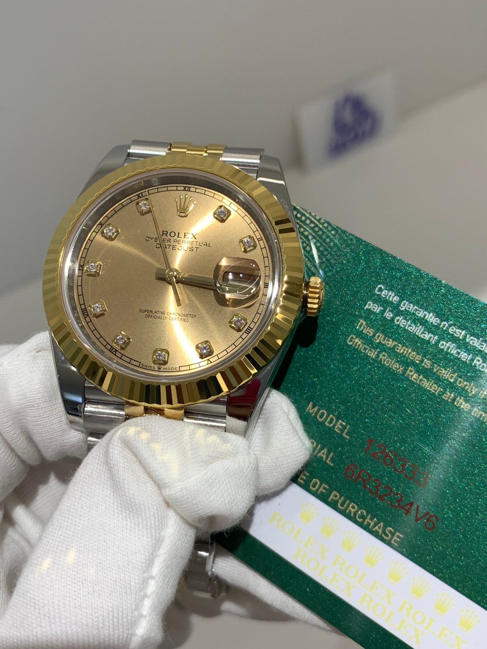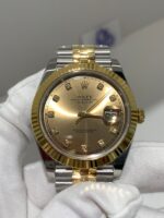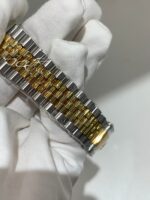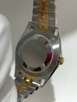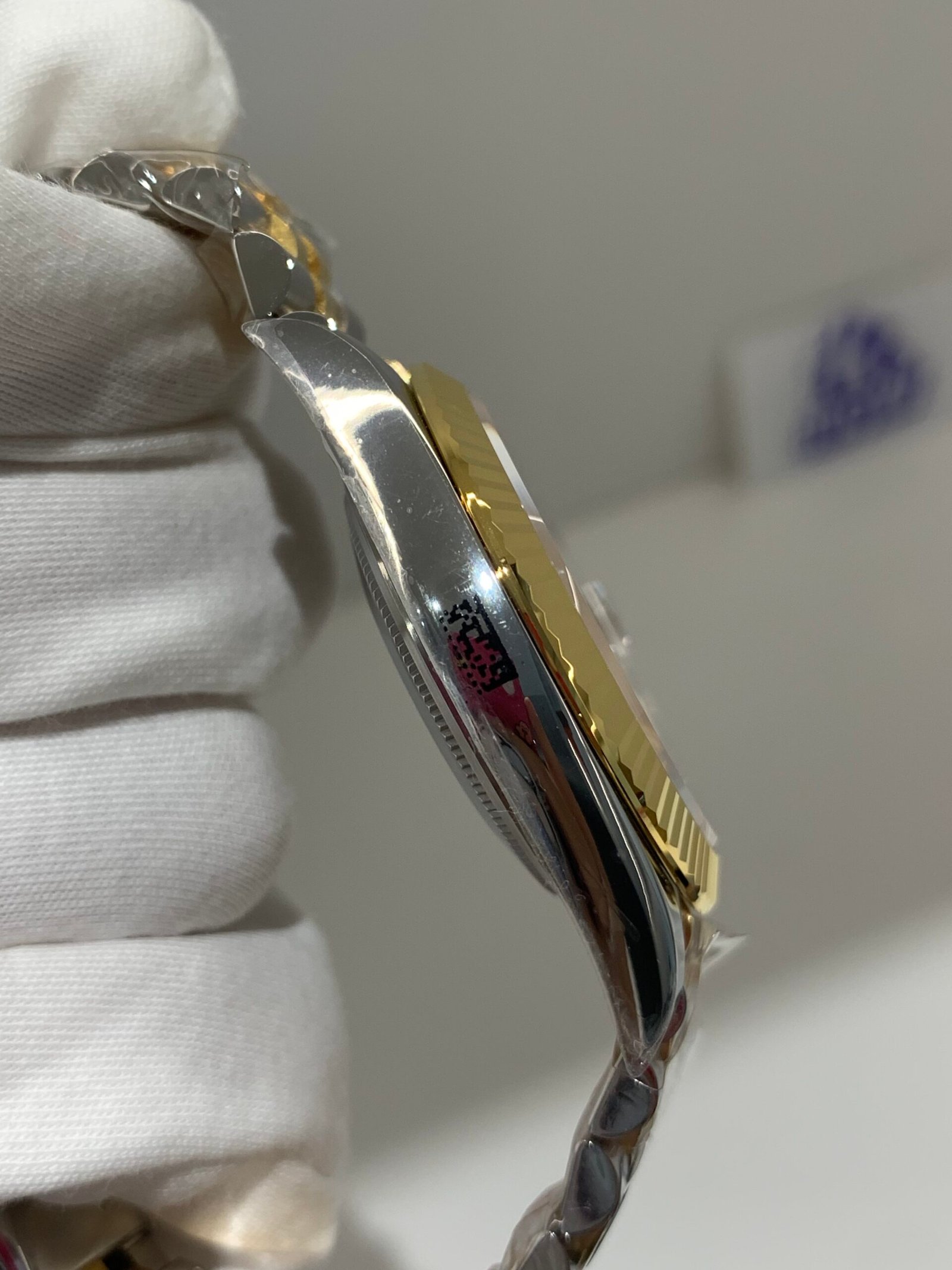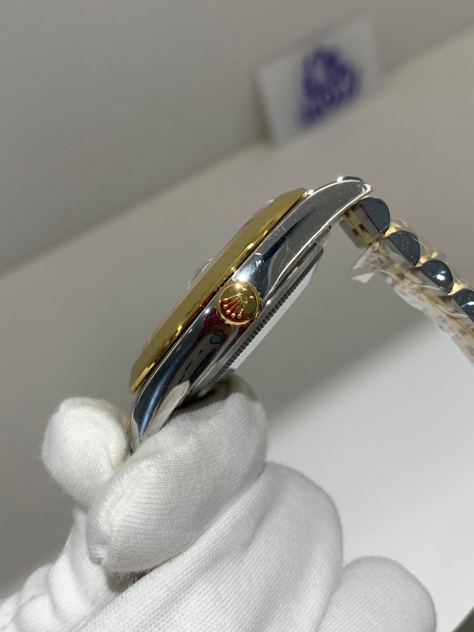 18K Yellow Gold & 904L Oystersteel Finish VSF continues its dominance in case machining. The combination of 18K yellow gold and 904L stainless steel—known as Yellow Rolesor—features industry-leading brushing on the steel lugs and polished yellow gold accents, paired with a buttery smooth Jubilee (five-bead) bracelet taper that feels identical to the genuine article on the wrist.