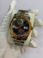 Polished 18K Yellow Gold Fluted Bezel A classic fluted bezel crafted from 18K yellow gold, perfectly polished to a mirror shine—an iconic Rolex signature. Originally designed for functional waterproofing (to screw the bezel onto the case securely), the fluting now serves as a distinguished aesthetic element, framing the champagne sunburst dial elegantly without distraction and maintaining the correct curvature relative to the mid-case, matching the genuine’s proportions exactly. The polished yellow gold bezel complements the warm, radiant tone of the champagne dial, highlighting the model’s luxurious temperament and harmonizing with the Yellow Rolesor material blend.