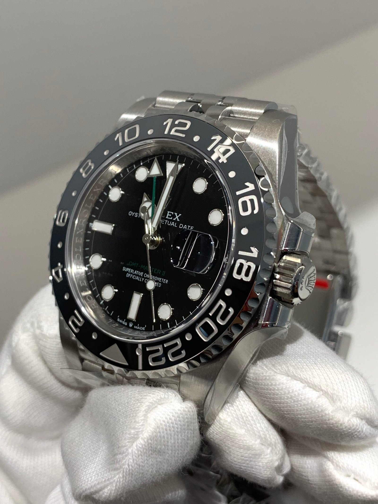 Crisp black dial with clear white gold applied markers. The GMT hand and indices feature strong Chromalight lume. All text, fonts, and spacing are executed to genuine spec.